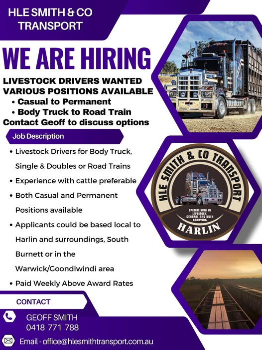 Livestock drivers needed for body truck & road trains, casual to permanent positions available with paid weekly above award rates.
