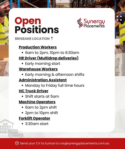 Job Tags:Brisbane, No Drivers Licence, Synergy Placements Australia.