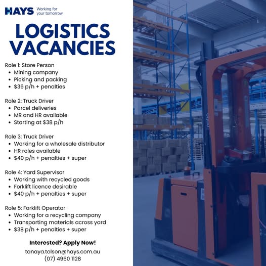 Logistics jobs available, including store person, truck driver, and forklift operator roles with varying pay rates.