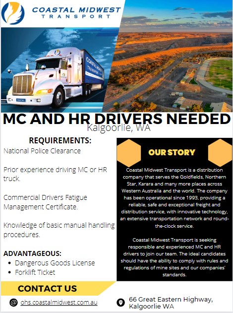 Coastal Midwest Transport are hiring MC and HR drivers in Kalgoorlie, Western Australia.