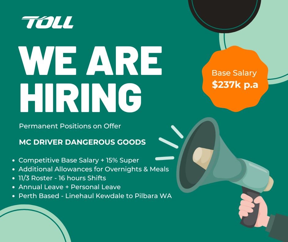 MC Driver for Perth-based linehaul route, earning $237k p.a. with competitive salary, allowances & leave benefits.