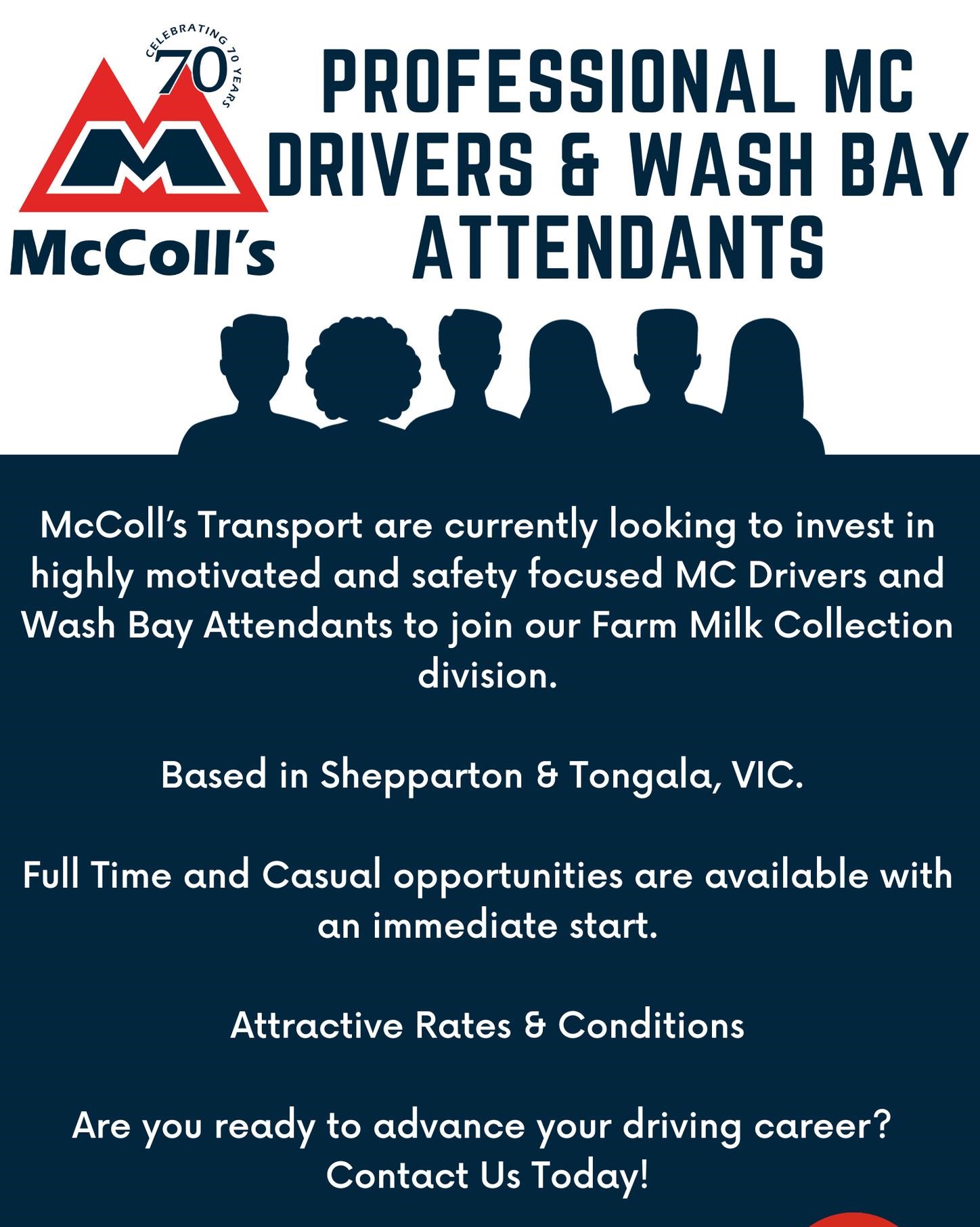 McColl's currently has multiple opportunities for motivated MC Drivers and Wash Bay Attendants to join our Farm Milk Collection division in Northern Victoria.