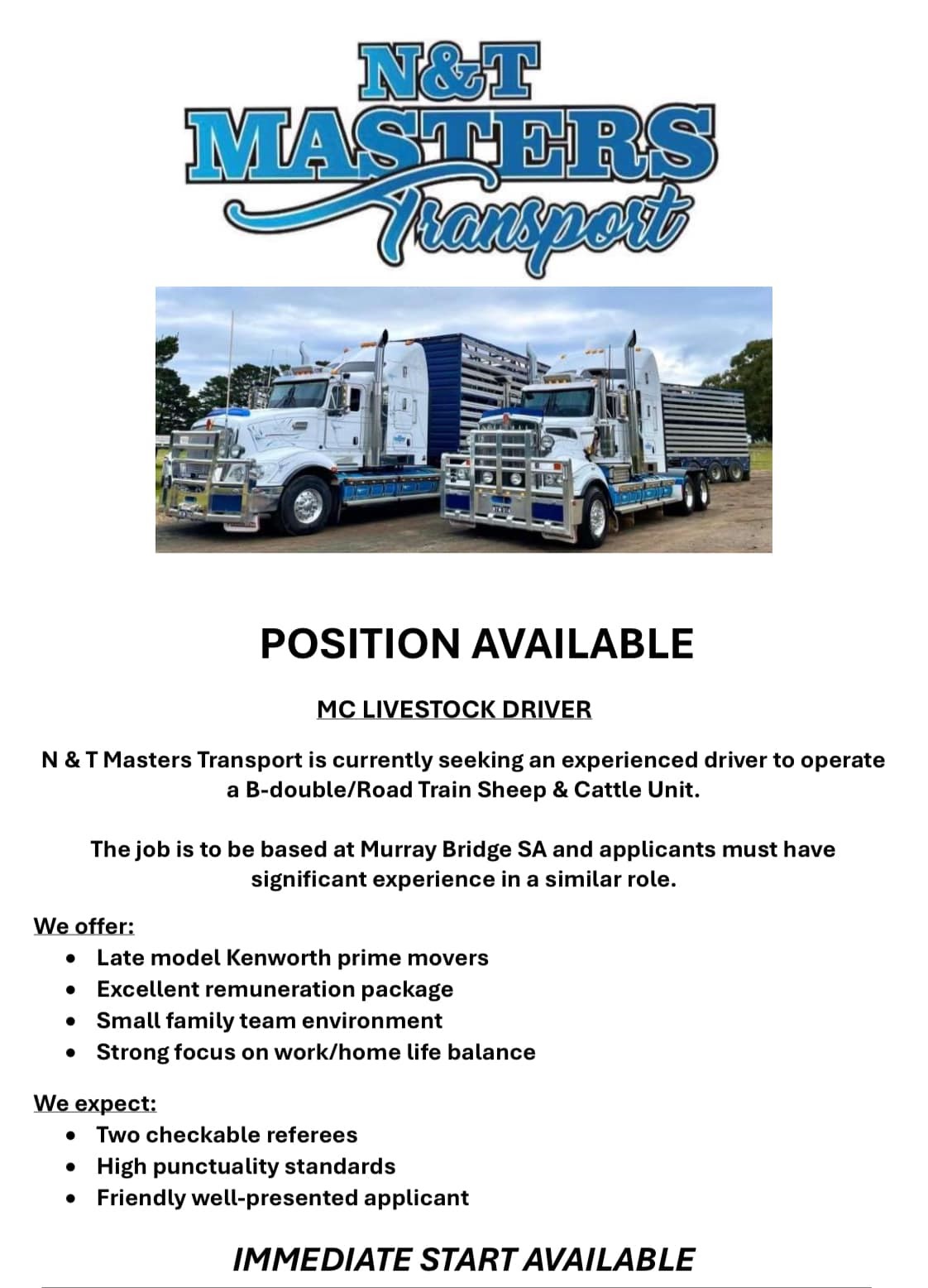 N & T Masters Transport is currently seeking an experienced driver to operate a B-double/ Road Train sheep & cattle unit.