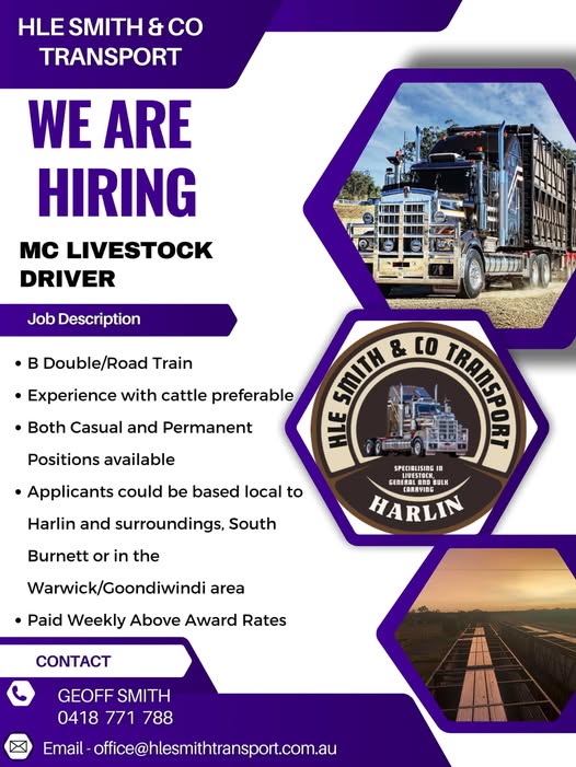 MC Livestock Driver: Experience with cattle preferred, double/truck driving, paid weekly above award rates.