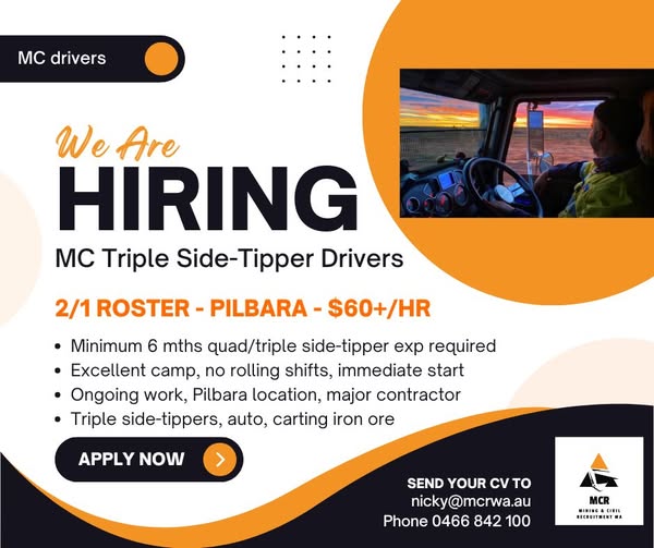 MC triple side-tipper drivers needed for ongoing work in Pilbara, $60+/HR, with 6mths quad/triple experience required.