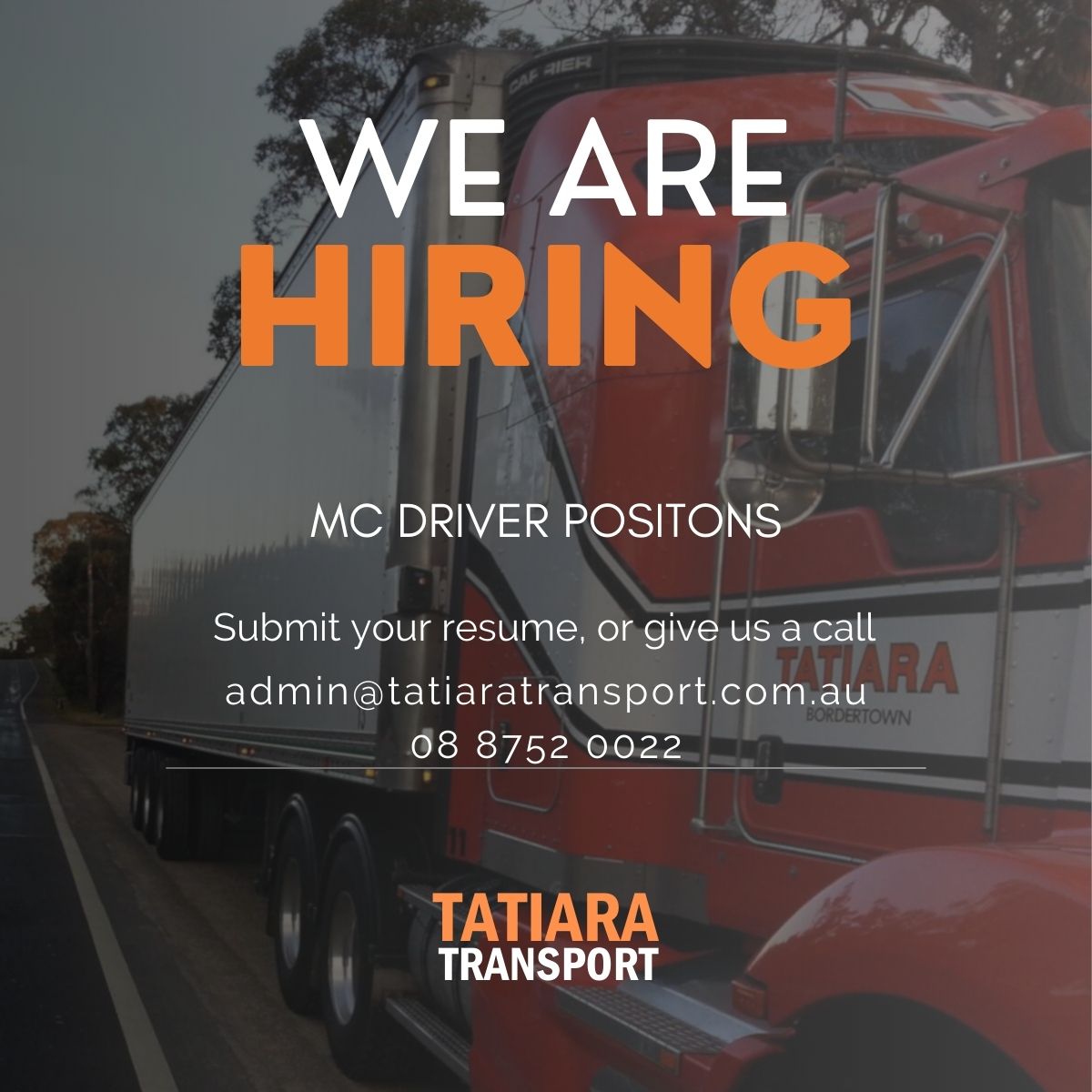 Tatiara Transport seeks an experienced MC Licensed Driver to join our top-notch team. Flexible working arrangements for the right person. (E.g., full time, rostered & regular SET runs.)