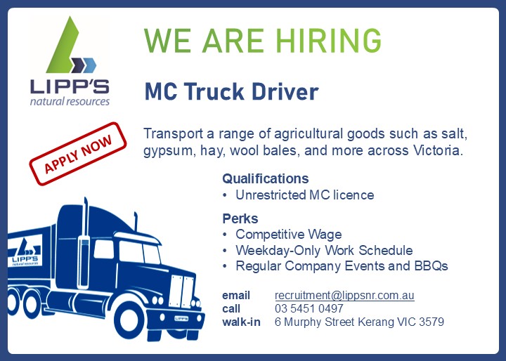 MC truck driver transporting agricultural goods in Victoria with competitive wage & regular company events.