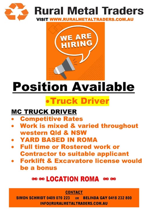 Seeking MC truck driver for mixed & varied work in western QLD & NSW, with competitive rates and yard-based in Roma.