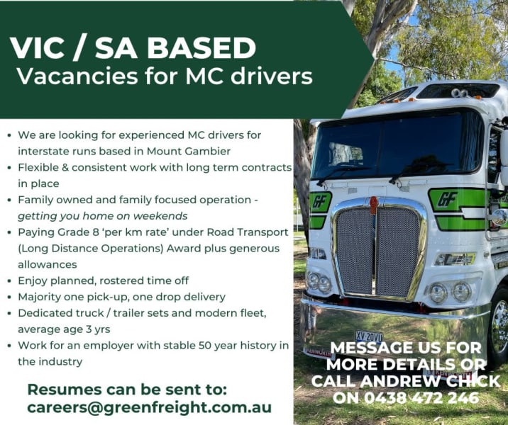 We are looking for experienced MC Drivers for interstate runs based in Mount Gambier.