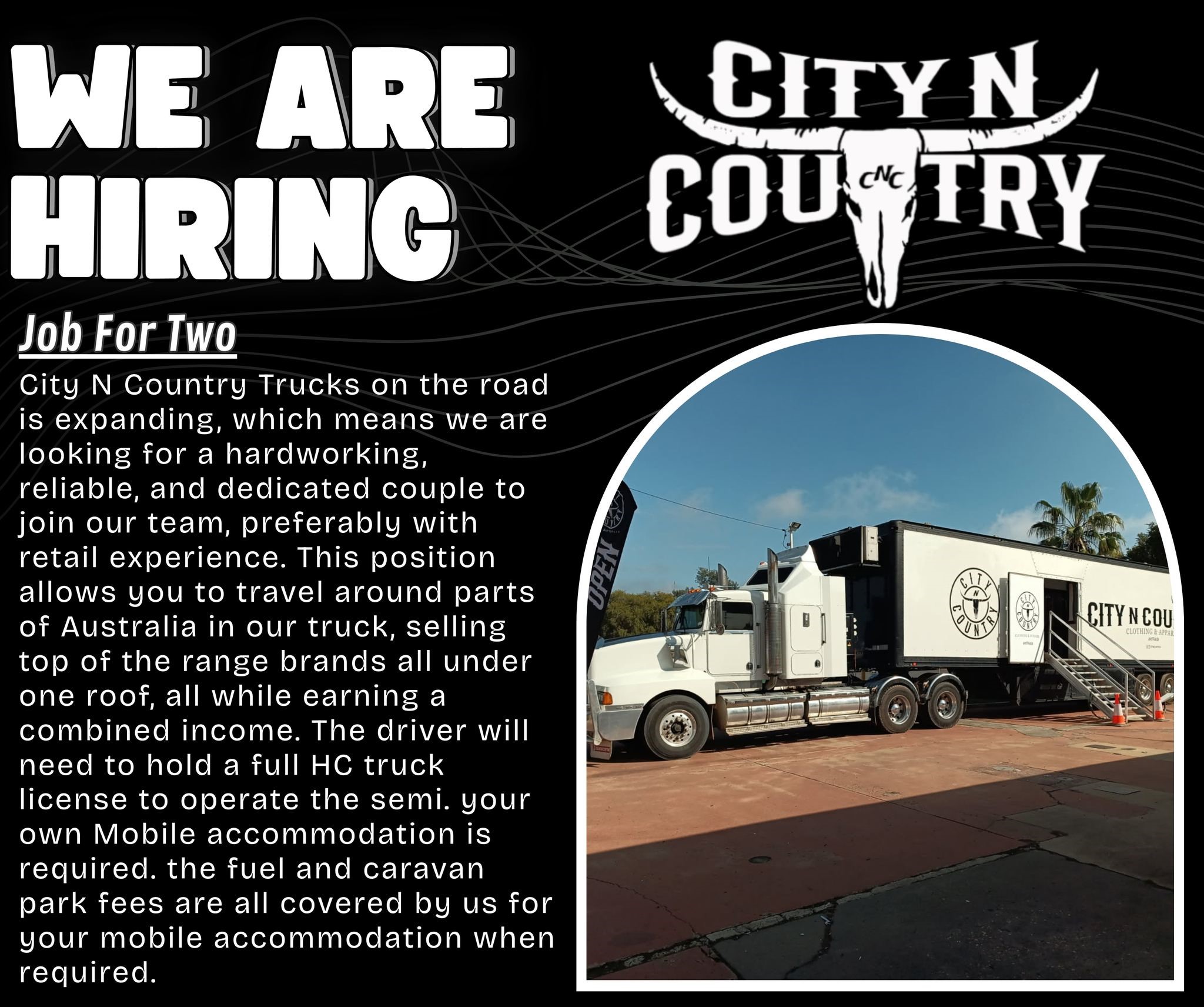 "Join City N Country Trucks as a traveling retail couple, selling top brands across Australia, with full HC truck license & mobile accommodation provided."