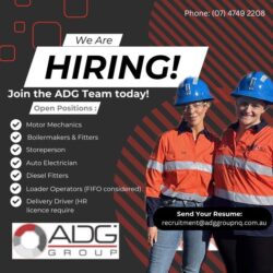 Join ADG Team as a Motor Mechanic, Boilermaker, Storeperson, or Delivery Driver, and enjoy benefits like competitive pay, training opportunities, and FIFO support.