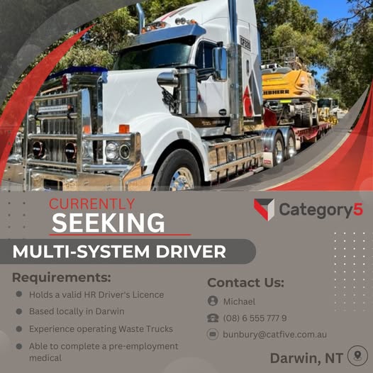 "Multi-system driver sought for local waste truck operations in Darwin, requiring HR Driver's Licence and pre-employment medical."