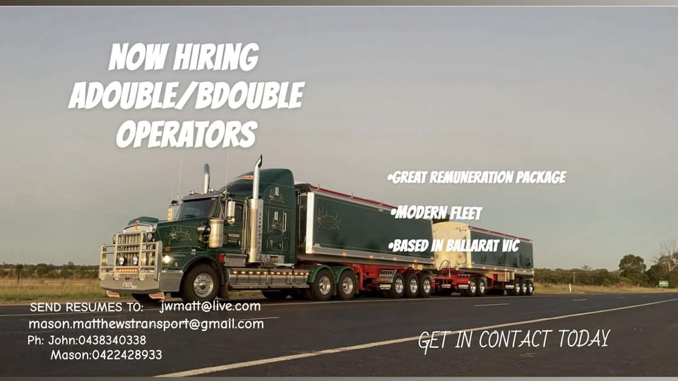 "Join Mason Matthew Transport as an Adoule/BDouble Operator in Ballarat VIC, with a great remuneration package and modern fleet."
