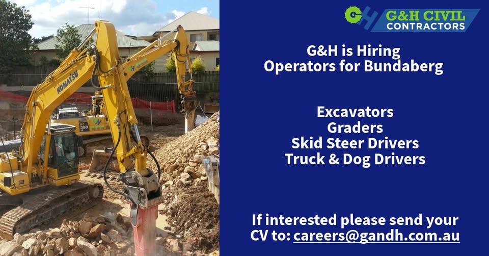 Experienced operators needed for excavator, grader, and truck operations in Bundaberg.