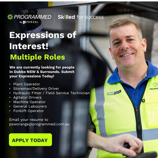 Job seekers in Dubbo NSW & Surrounds needed for various roles, including plant operation and logistics support.