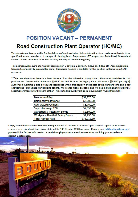 Road Construction Plant Operator (HC/MC) ( Boulia Shire Council QLD )