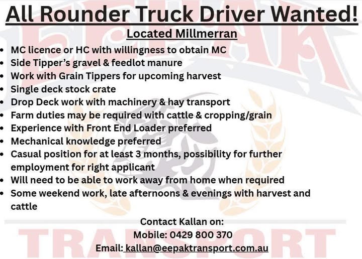Job Tags:EEPAK Transport, MC Licence, MILLMERRAN.