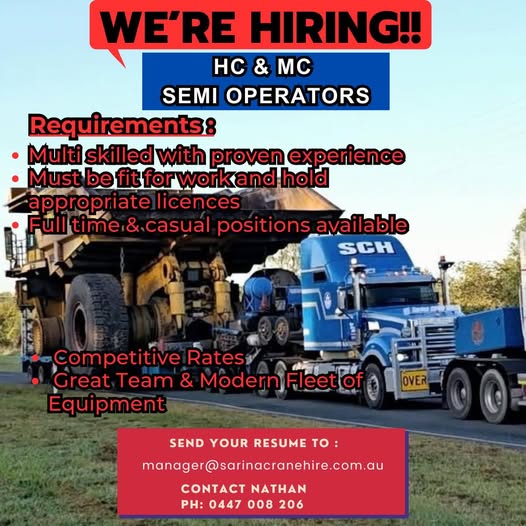 Job Tags:HC Licence, SARINA, Sarina Crane Hire.