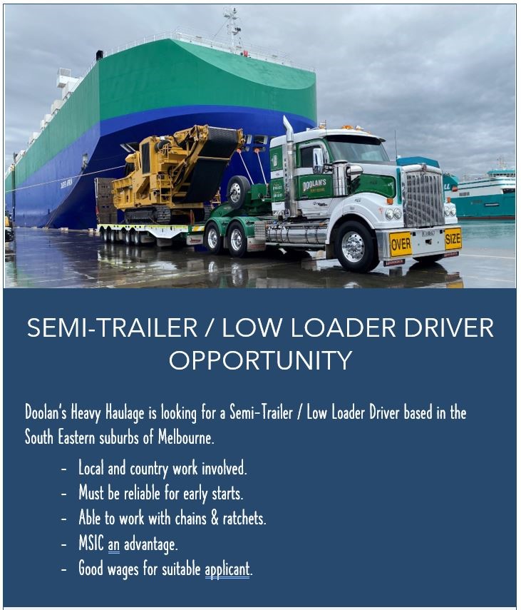WE ARE HIRING. Looking for a Semi-Trailer / Low Loader Driver based in the South Eastern suburbs of Melbourne, for local and country work.
