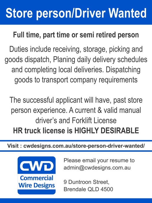 The successful applicant will have past store-person experience and a current, valid manual driver’s licence and forklift licence. An HR truck licence is highly desirable.