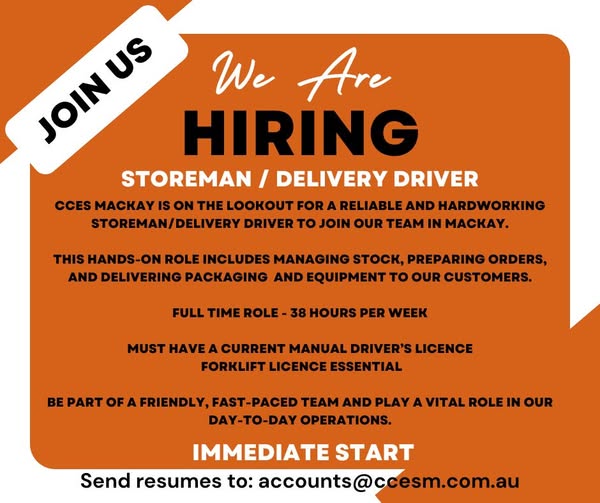 CCES MACKAY IS ON THE LOOKOUT FOR A RELIABLE AND HARDWORKING STOREMAN/DELIVERY DRIVER TO JOIN OUR TEAM IN MACKAY.