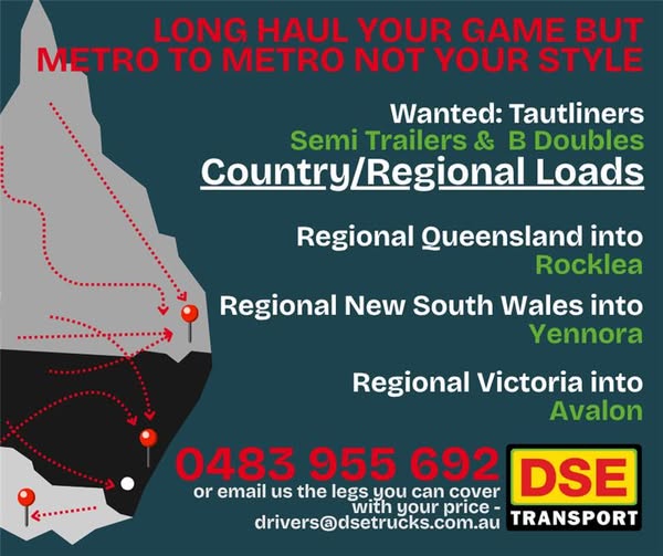 Email or be the loads you can cover: drivers@dsetrucks.com.au