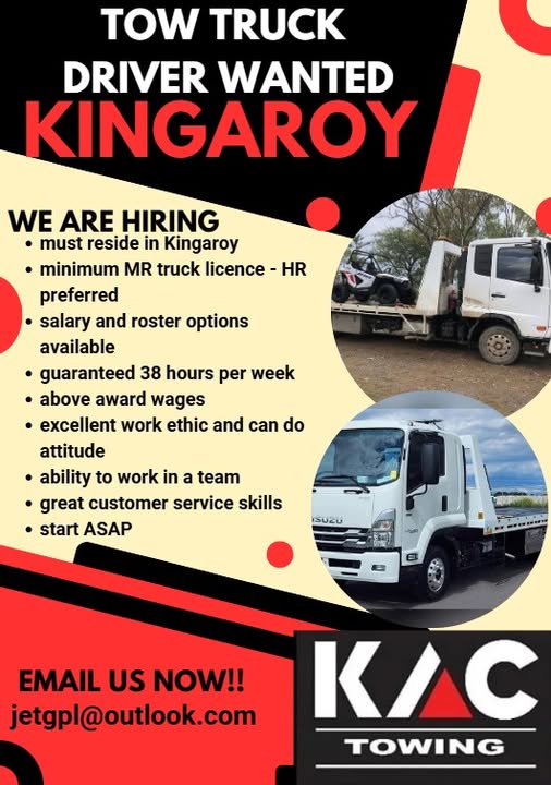 TOW TRUCK DRIVER WANTED: Kingaroy, 38hr/week, above award wages, guaranteed roster & excellent customer service skills.