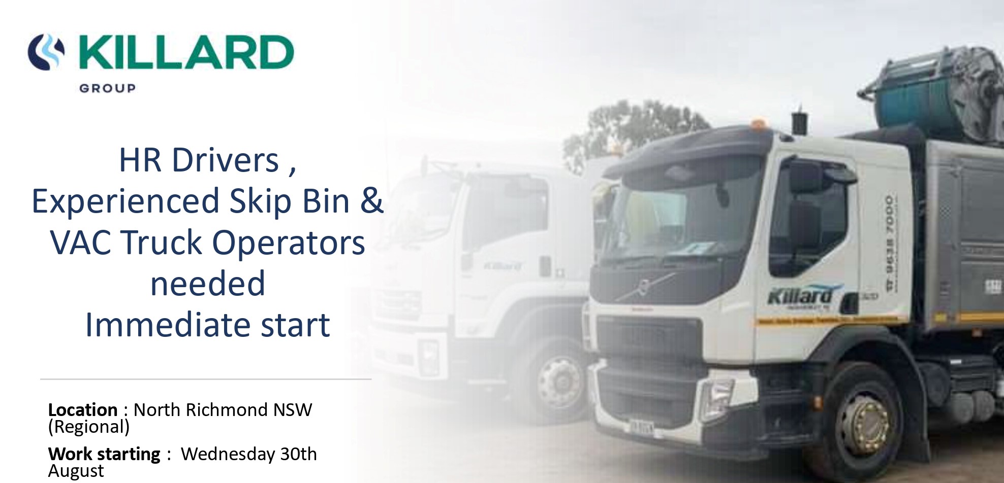 HR Drivers, Experienced Skip Bin and VAC truck operators needed.
