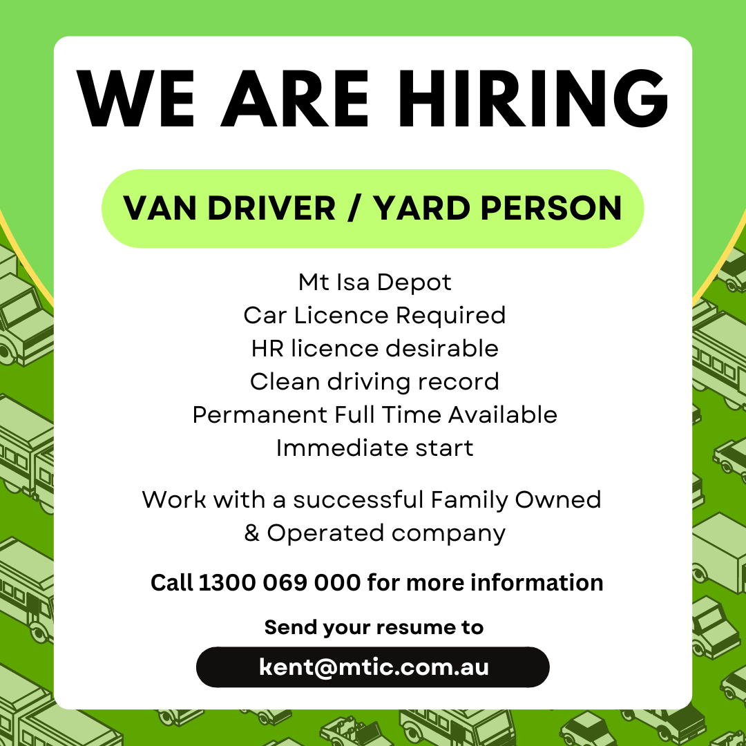 We are looking for a Van Driver / Yard Person for our Mt Isa Depot
