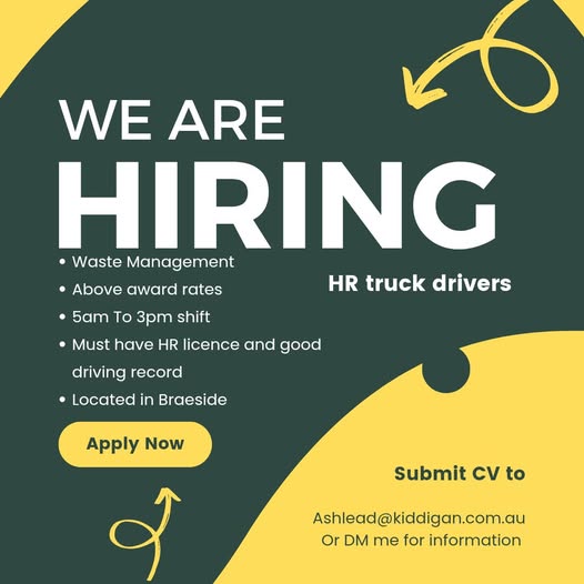 Due to rapid growth, our business Kiddigan Pty Ltd is seeking full time and casual HR drivers to join our team in waste management.