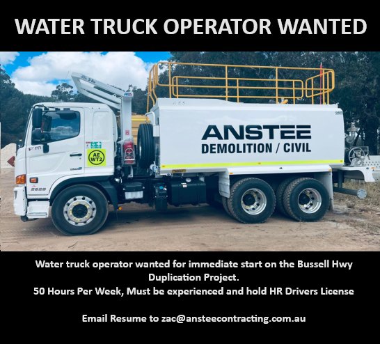 Water Truck Operator Wanted for an immediate start on the Bussell Hwy Duplication project.