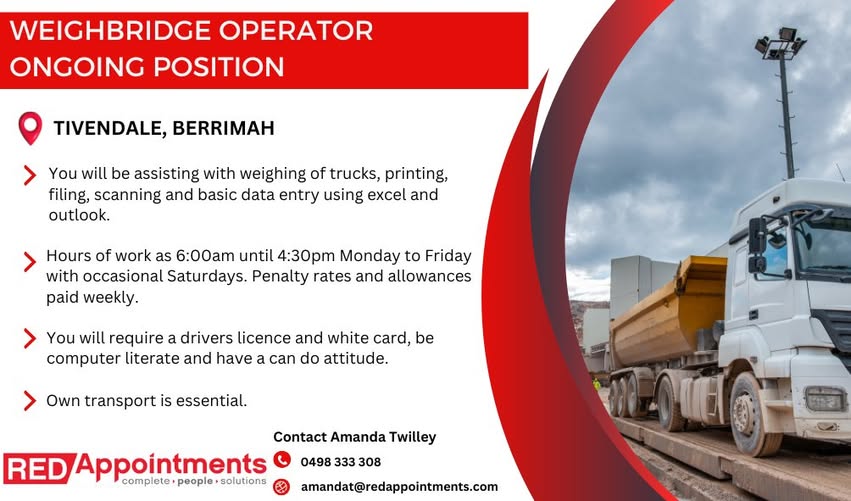 Weighbridge Operator: Assist with truck weighing, data entry & basic admin tasks, requiring a driver's license, white card & computer literacy.