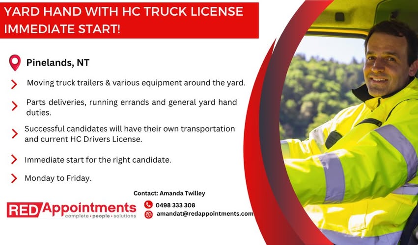 Yard hand with truck license needed, responsible for moving equipment, parts deliveries and yard duties, requiring own transportation and HC driver's license.