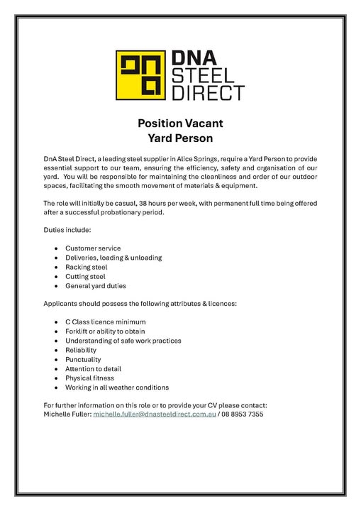 DNA Steel Direct, a leading steel supplier in Alice Springs, requires a Yard Person to provide essential support to our team, ensuring the efficiency, safety and organisation of our yard. The role will initially be casual, 38 hours per week, with full time being offered after a successful probationary period.