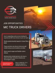 & KR GLASS Transport are a family owned and operated company seeking a self motivated, committed & positive team member to join us in the role of a MC truck driver on a 3 week on, one week off roster. The business is based in Cobar, NSW 2835.Above award wage. Successful applicants should have the […]